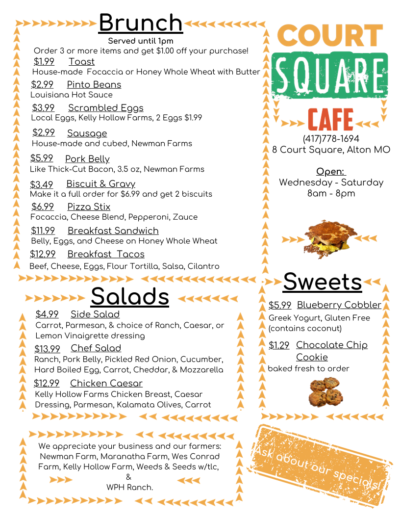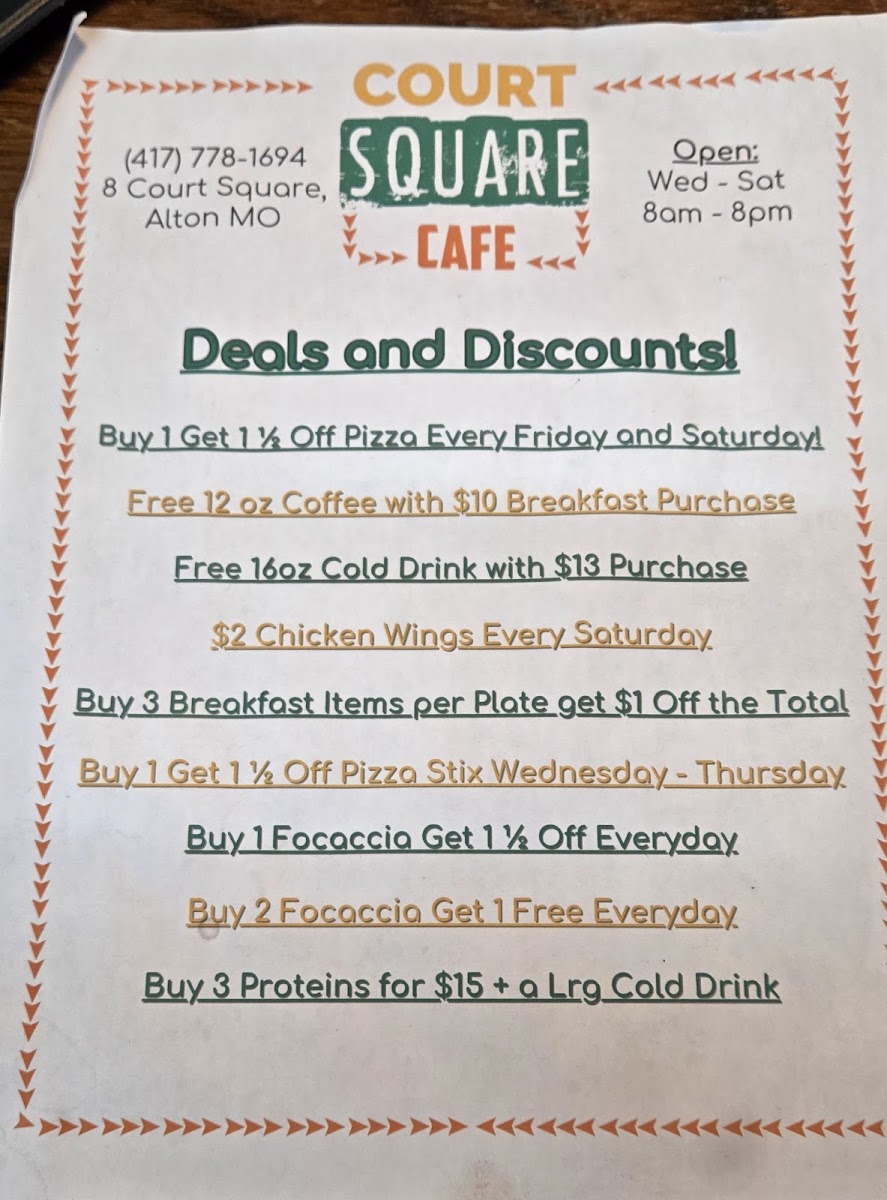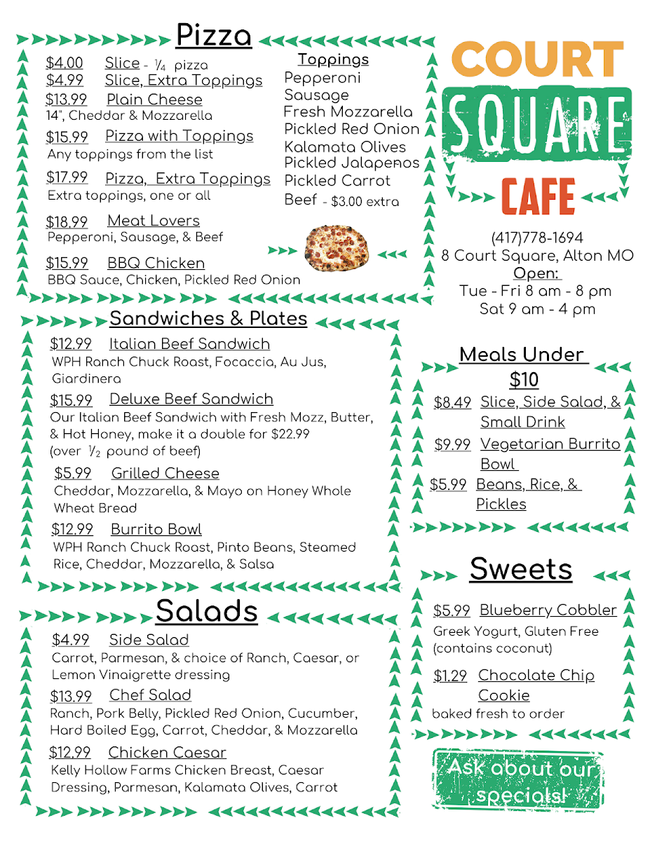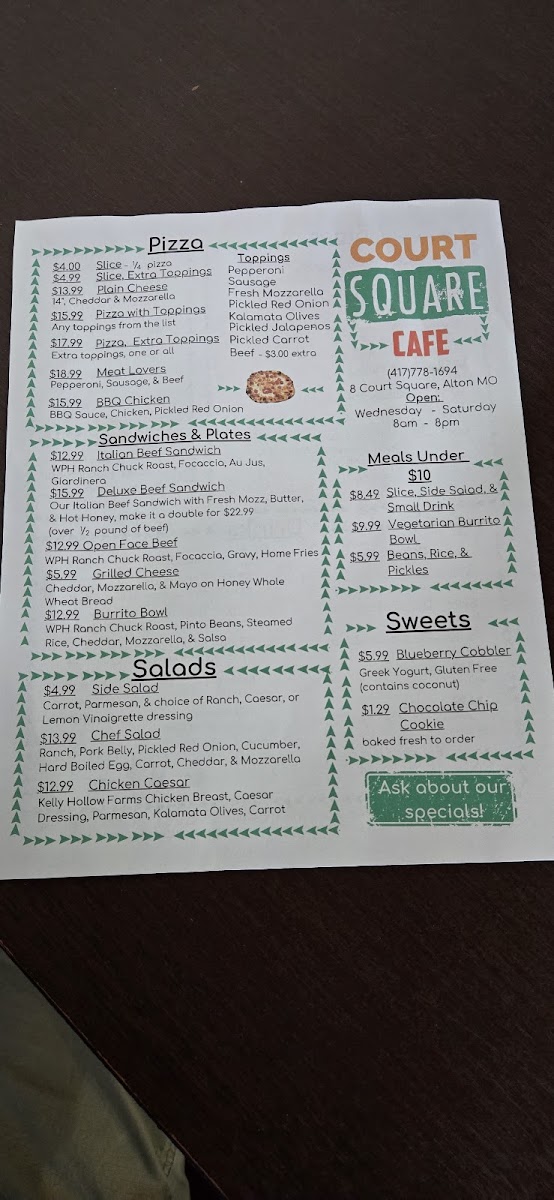 Court Square Cafe in Alton, MO, offers a diverse and inviting menu, perfect for anyone looking to enjoy a satisfying meal in a cozy setting. The menu has a variety of options to please different tastes, from comforting pizza to savory plates and freshly baked bread.